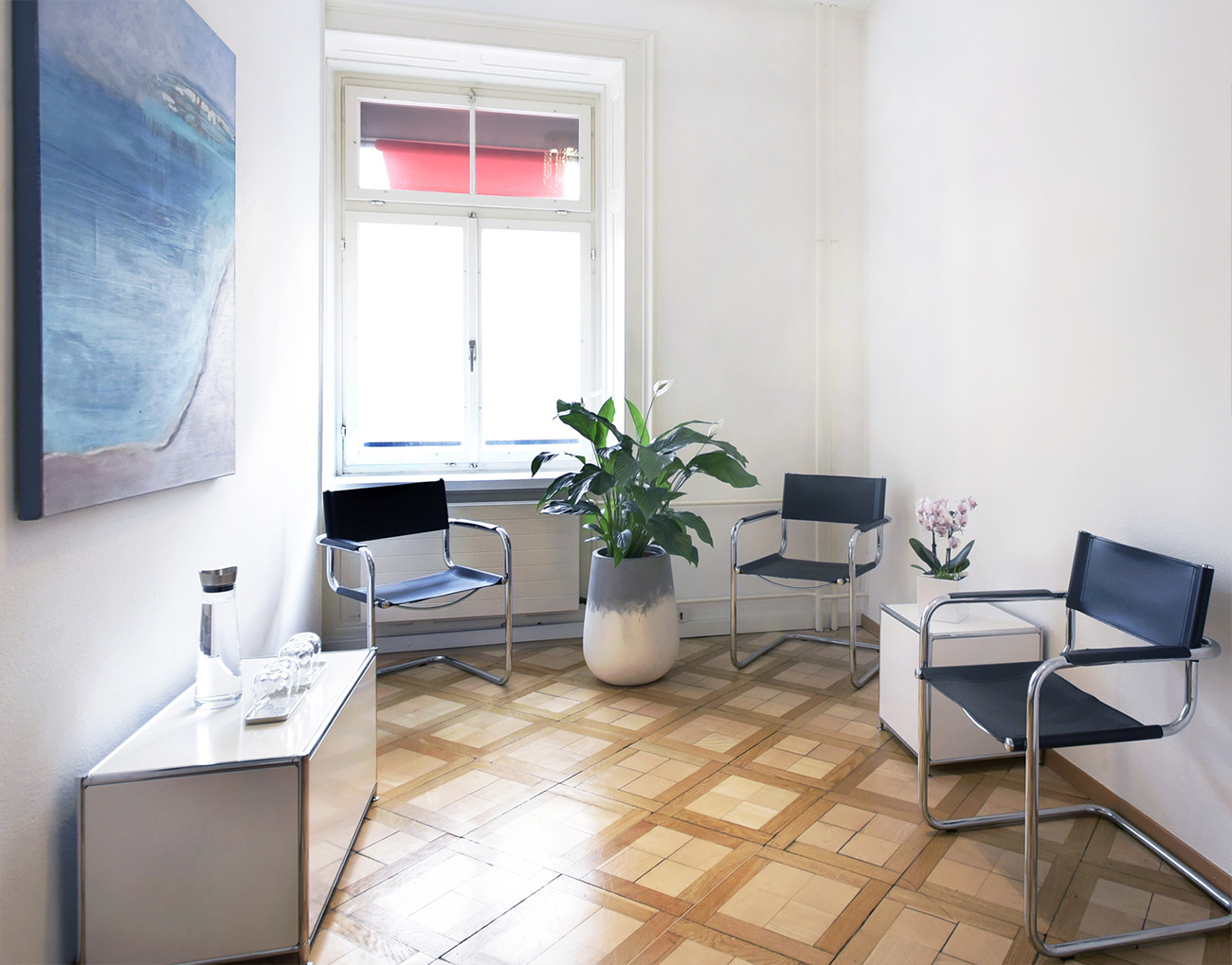 Falls Sie schon etwas früher bei uns sind, haben wir ein Wartezimmer mit dezenter Musik, Getränke und Lektüre.